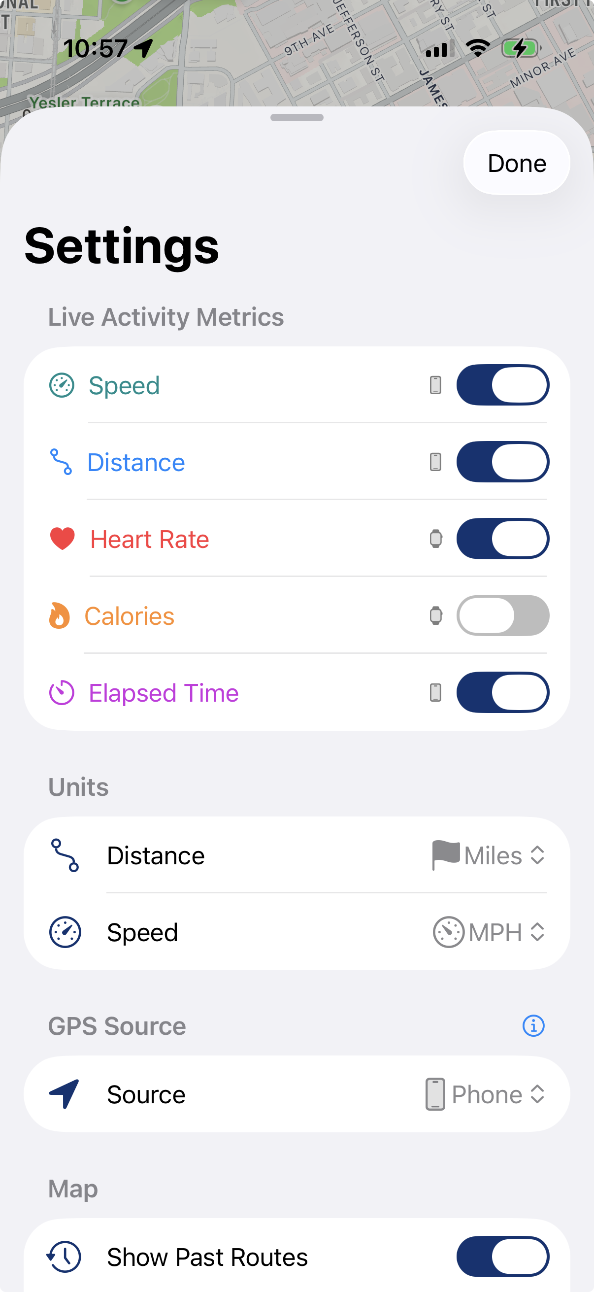Every session writes to HealthKit — distance, duration, active energy. Off by default; you stay in control.